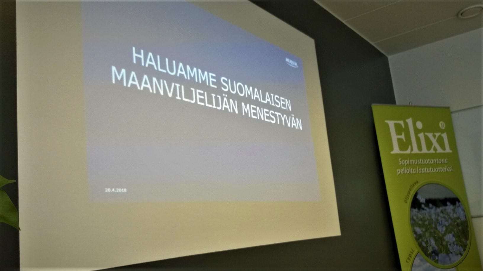 Elixin kauden ensimmäiset sopimusviljelypäivät pidettiin 20.4.2018 Somerolla. Kymmenen viljelijää kokoontui kuuntelemaan ja keskustelemaan alkukasvukauden viljelytoimenpiteistä öljypellavalla ja öljyhampulla. Aluksi käytiin läpi perusasioita öljypellavan ominaisuuksista sekä viljelykierroista ja sen jälkeen syvennyttiin viljelyteknisiin asioihin. Kokeneiden viljelijöiden keskusteluissakin koettiin, että kosteuden säilyttäminen on tärkeintä ja kaikki muokkaustoimenpiteet tulee tehdä riittävää kosteutta ylläpitäen. Pellavaosion jälkeen keskityttiin öljyhampun viljelyyn ja pohdittiin vähän olemassa olevia haasteitakin. Tärkeintä on onnistua kylvössä: tasainen ja nopea alkuunlähtö luo hyvät lähtökohdat tasaiselle kasvustolle ja täyspeittävä hamppukasvusto on parasta kasvinsuojelua!